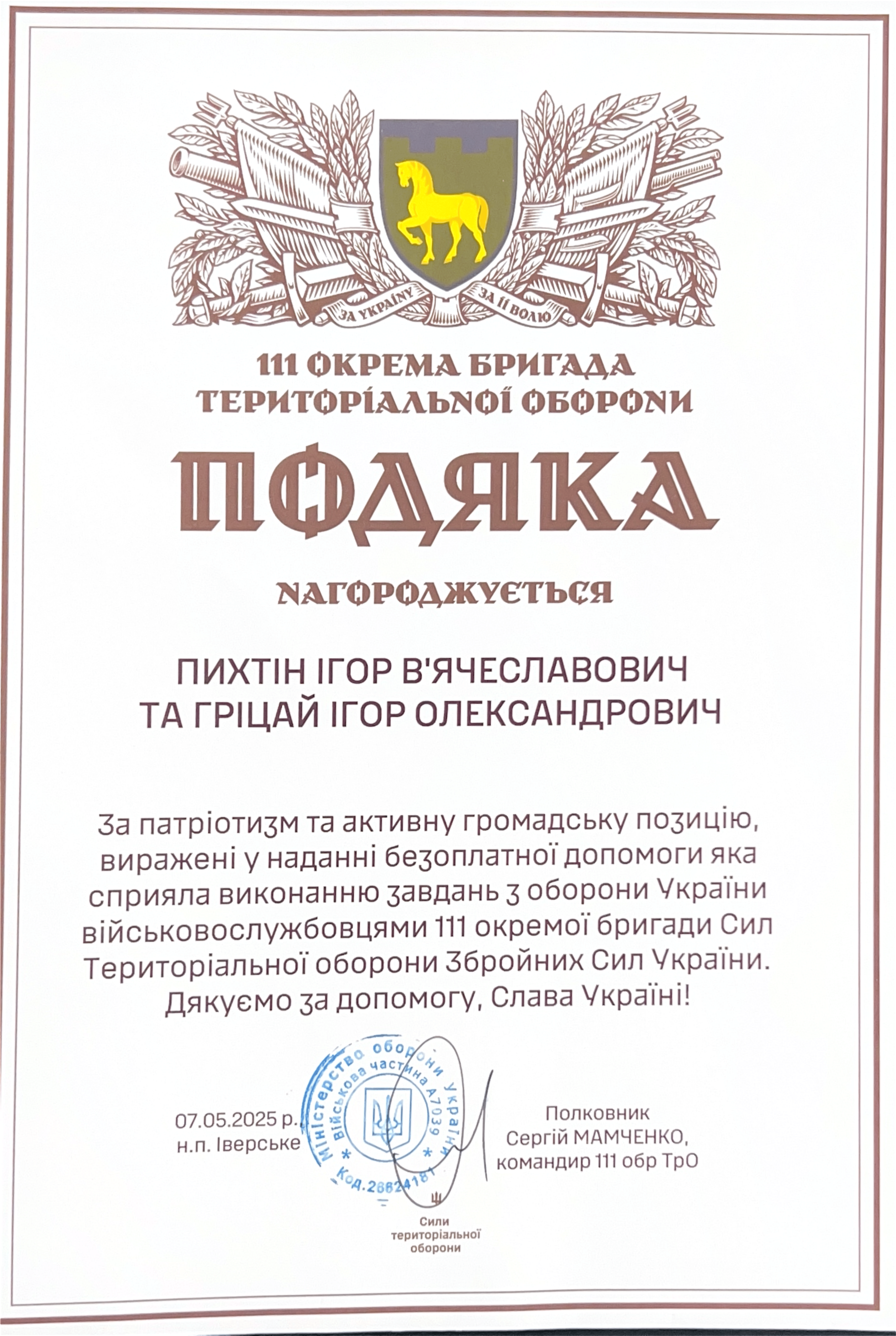 За цю підтримку Центр правової допомоги отримав подяку від командира 111 обр ТрО, полковника Сергія Мамченка, який відзначив наш патріотизм та активну громадянську позицію.
