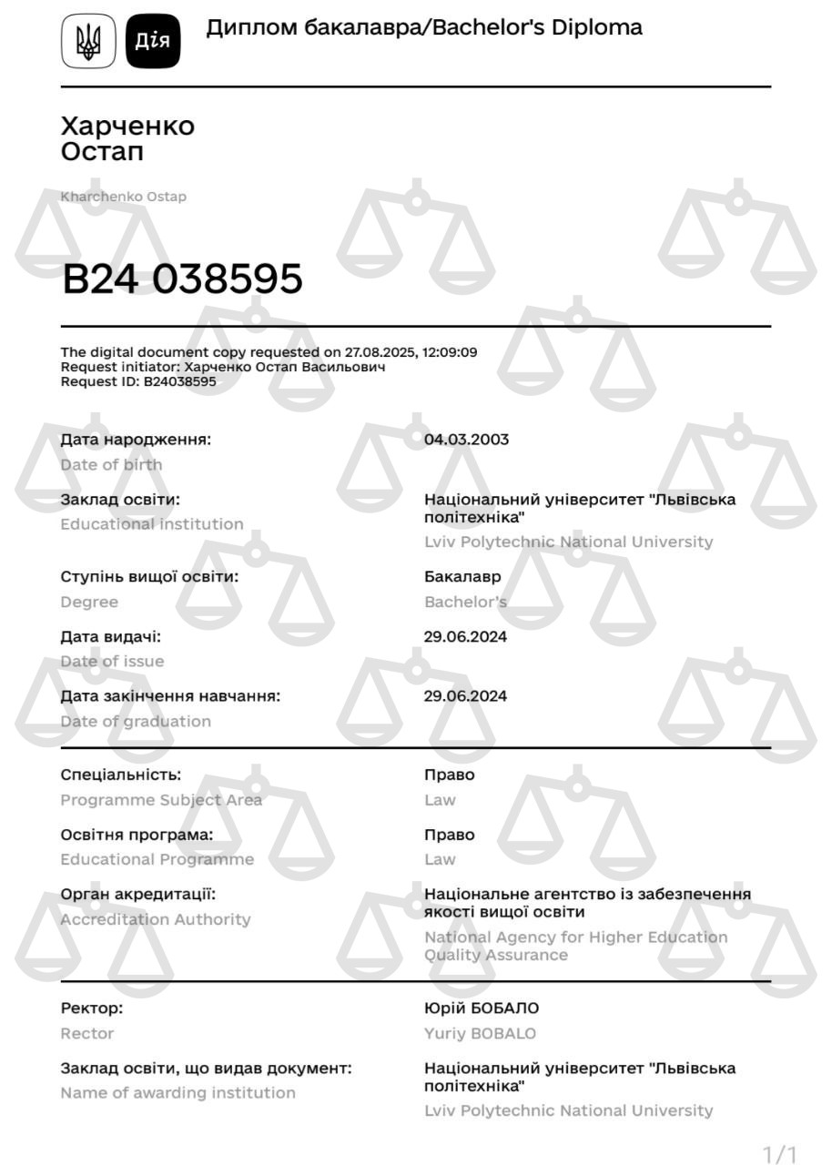 Пишаюся кожною справою, де вдалося повернути клієнтові впевненість у собі та справедливість рішення. Для мене право -не набір кодексів, а інструмент, який повинен працювати на людину. Вірю, що навіть один професійний юрист може змінити історію - якщо працює з душею та відповідальністю.