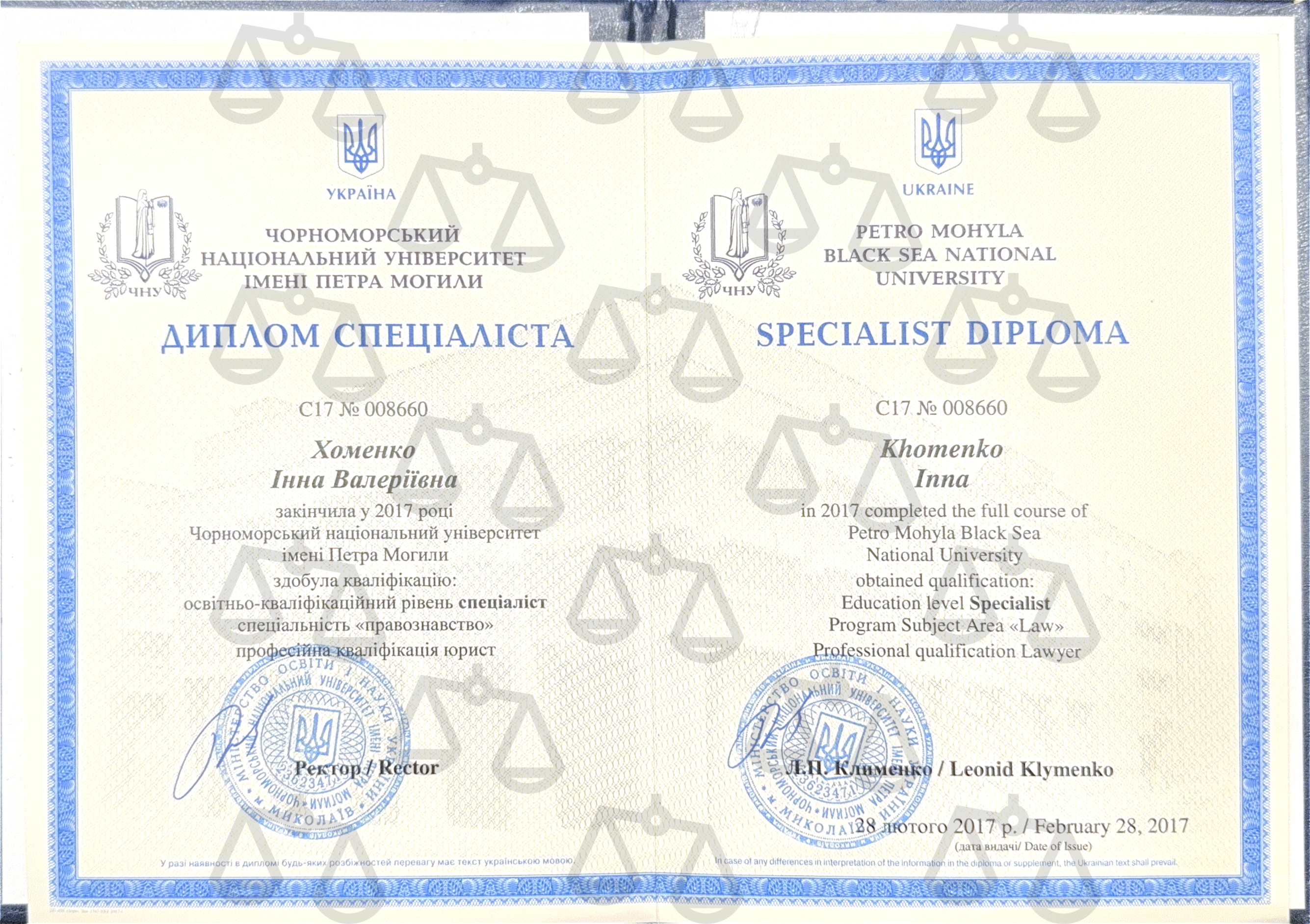 У роботі керуюсь принципами чесності, конфіденційності та орієнтації на результат. Пишаюся тим, що вдалося успішно завершити низку справ, у яких клієнти отримали справедливе рішення та змогли відновити свої права. Вважаю, що місія юриста - не лише захищати, а й допомагати людині відчути впевненість перед законом.